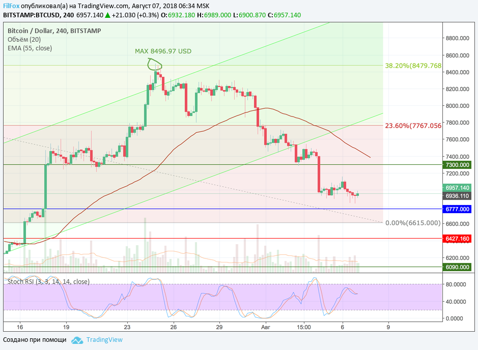 Медведи вчера доминировали на рынке, о чем свидетельствуют нарастающие объёмы продаж при подходе цены к ключевому уровню сопротивления 6777.00 USD. Несмотря на это, протестировать этот ключевой уровень пока так не удалось - покупатели отчаянно сражаясь, отбили атаку на минимуме 6835.06 USD. Но этот успех закрепить выше, чем 7200.00 не удасться.