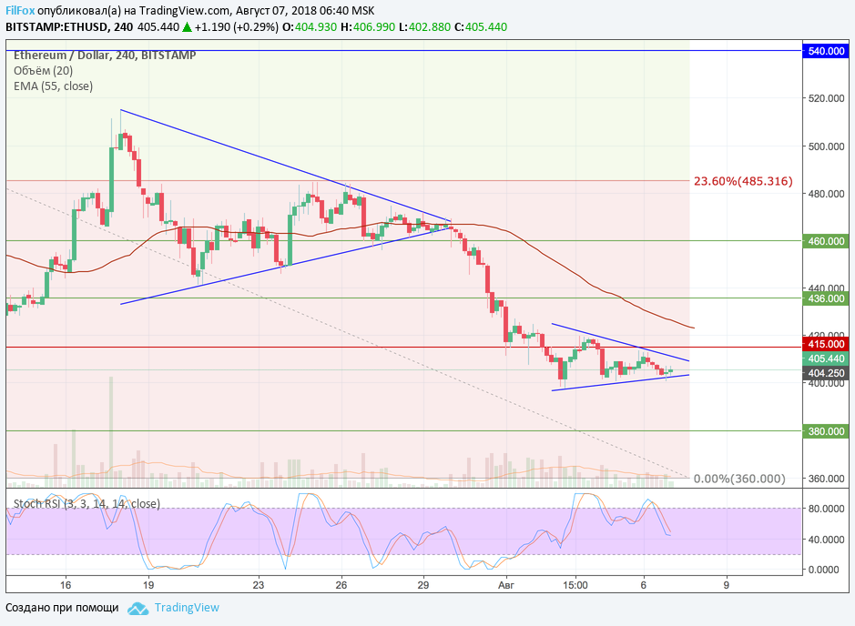 Только двум парам из первой десятки MarketCap удалось вчера удержаться в сужающемся боковике. Одна из них это ETH/USD. Нижняя граница треугольника удержала вчера Ethereum в консолидации, на отметке 404.00 USD. Стохастик находится в нейтральной зоне, что подтверждает боковое движение пары, но уже сформировался сигнал на рост.