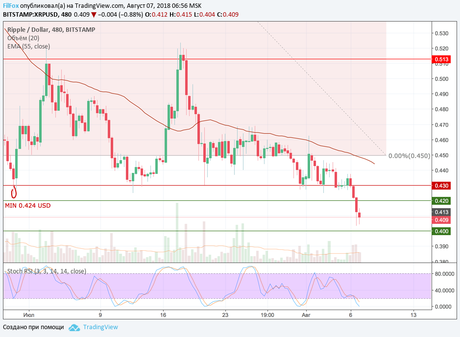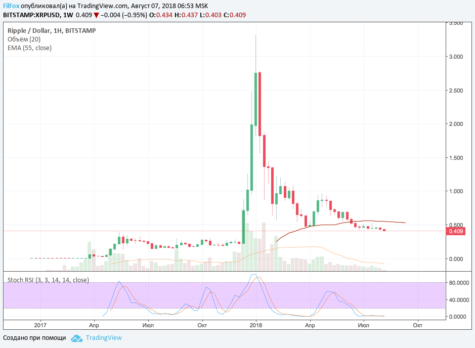 Полагаем, что Ripple ещё не достиг своего дна и вскоре нас ожидает целая череда обновлённых минимумов. Например, сегодня, судя по показаниям стохастика, дневной минимум обещает установить новый годовой рекорд в области цен, чуть ниже поддержки 0.400 USD.