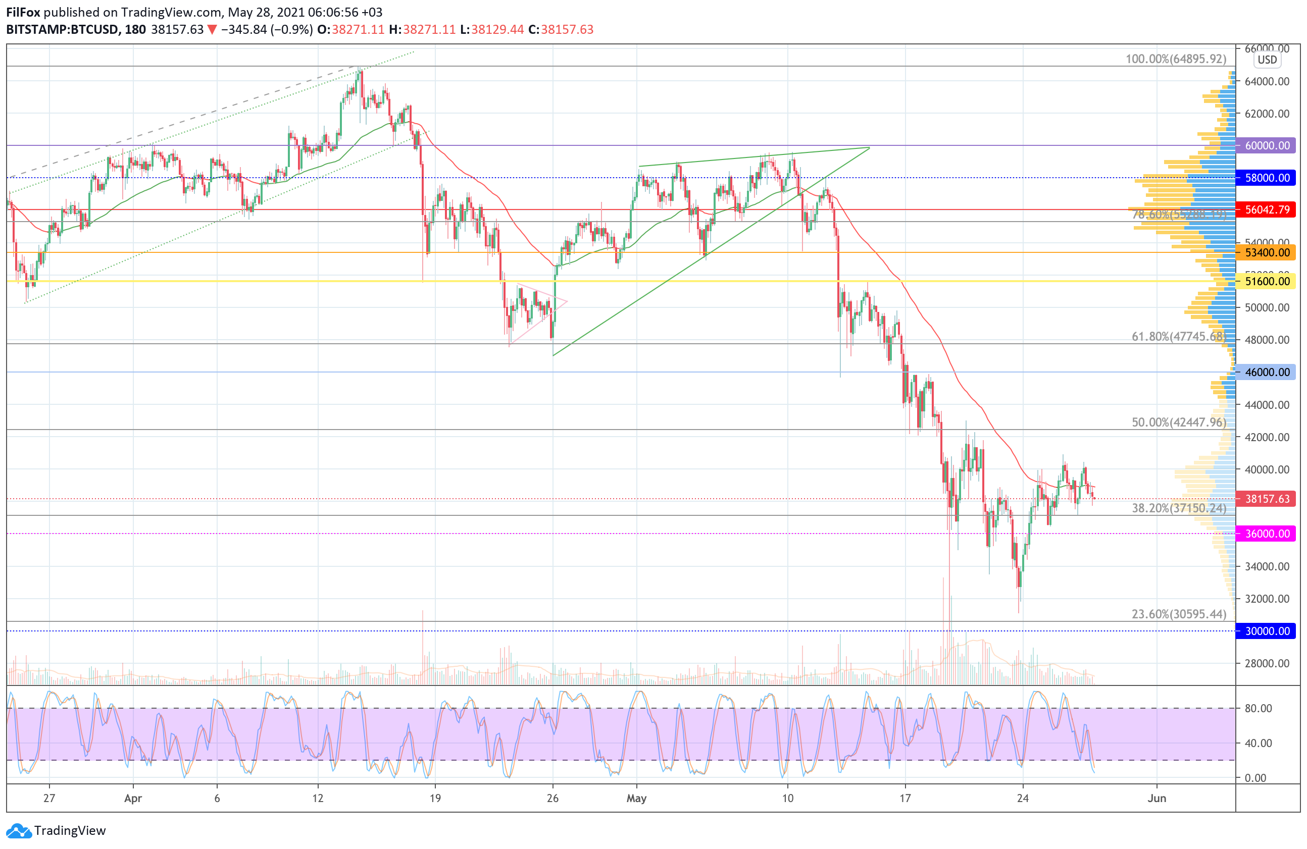 Вчера утром цена BTC протестировала уровень 38.2% фибо (37150.24 USD). Этот уровень фибоначчи оказал паре поддержку и до вечера цена восстановилась к отметке 40000.00 USD.