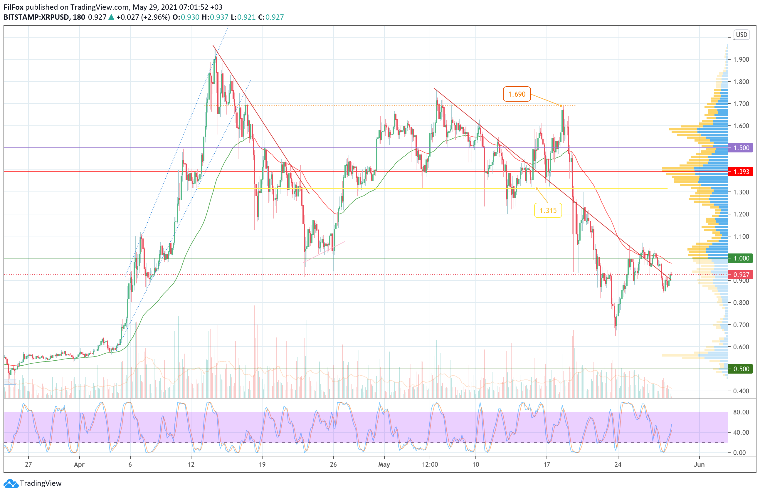 Вчера цена XRP просела ниже красной нисходящей линии тренда. В районе отметки 0.850 USD покупатели попытались остановить снижение и вытащили пару из нисходящего канала, выше трендовой линии.