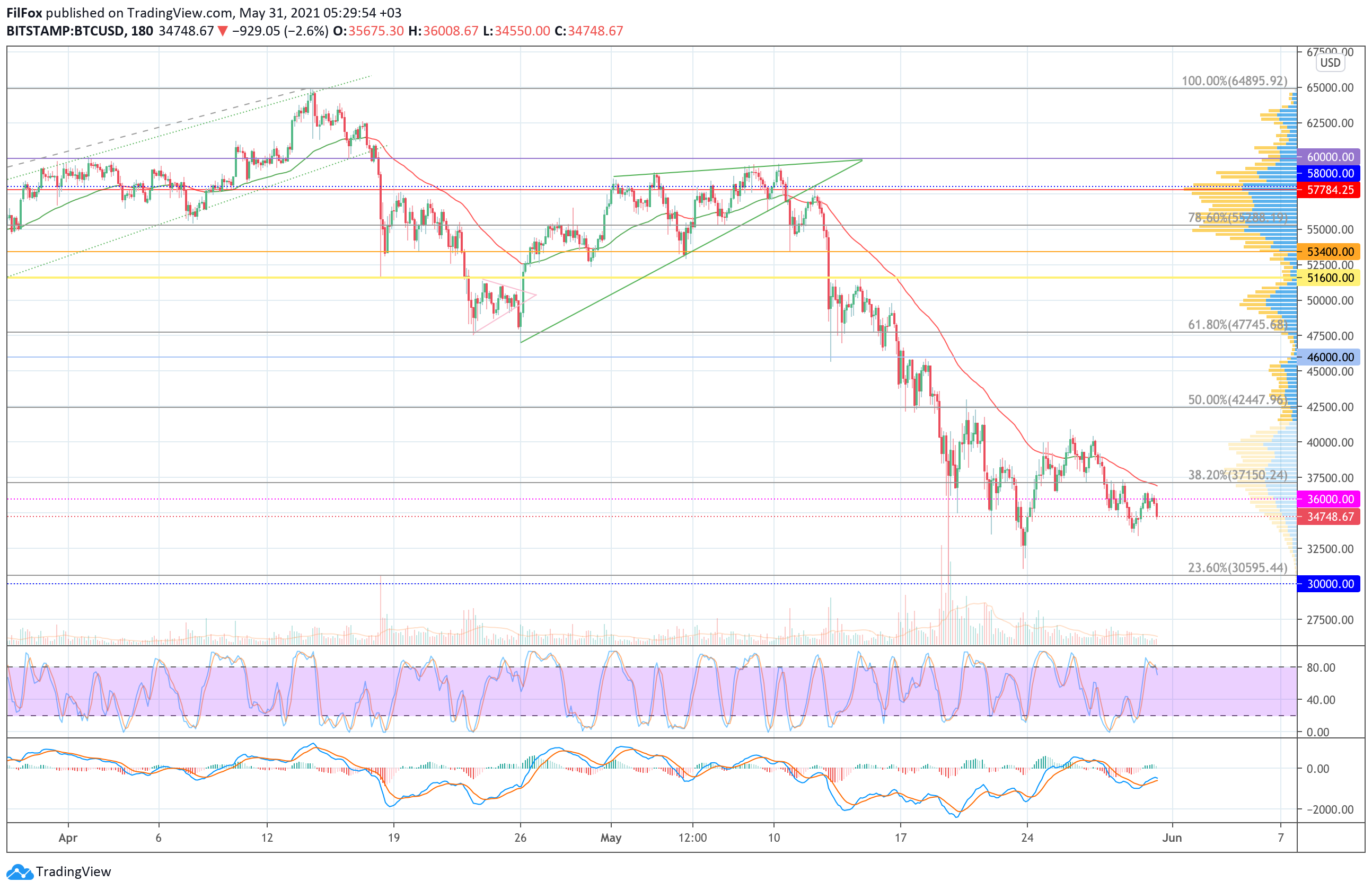 В минувшую субботу покупатели не смогли сформировать бычий импульс и пробить сопротивление уровня 38.2% фибо (37150.24 USD). К концу дня цена BTC откатилась в район отметки 33500.00 USD.