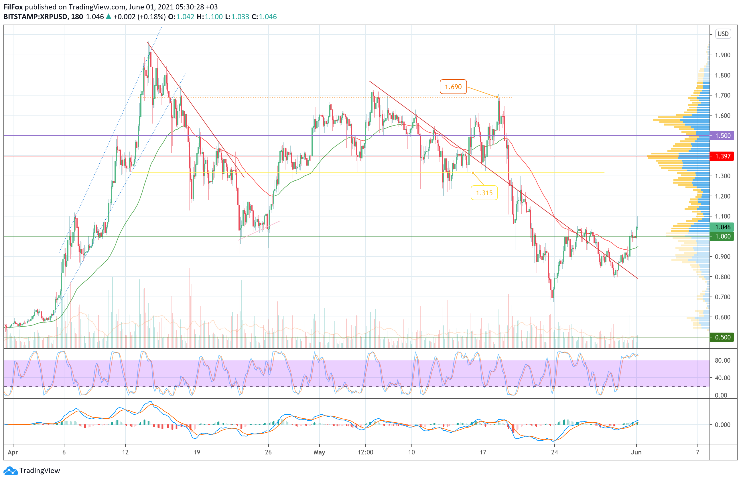 После обеда объёмы покупок сократились и цена XRP застряла в боковике прямо на отметке один доллар за монету.