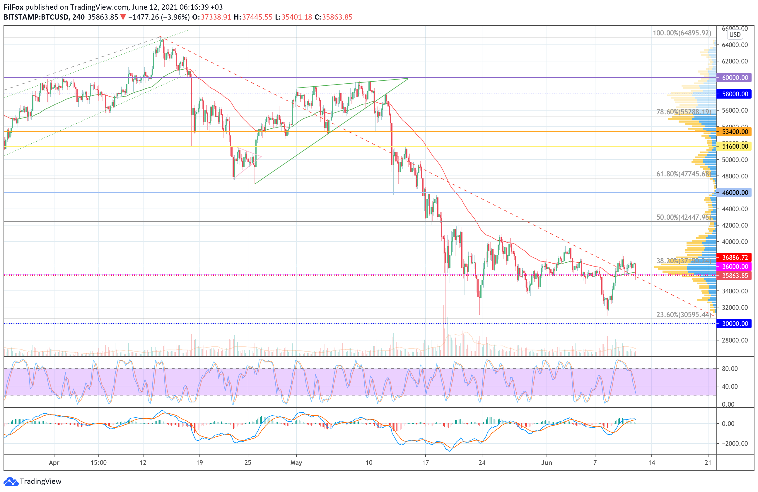 Вчера цена биткоина в течение дня консолидировалась на уровне 38.2% фибо (37150.24 USD). Объёмы покупок были ниже среднего уровня и пара не смогла пробиться в зону недельного максимума.