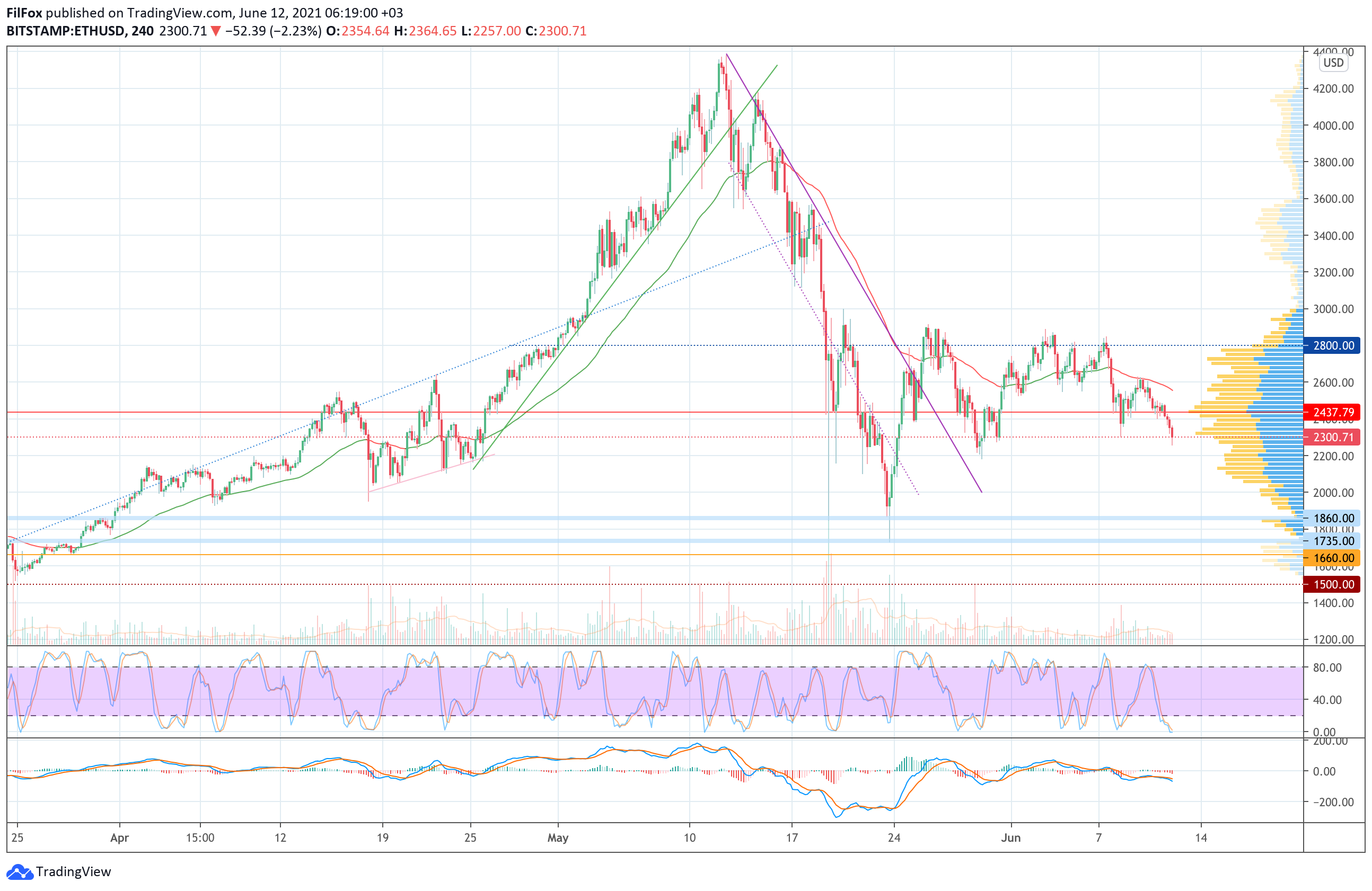 Вчера индикаторная линия POC не смогла удержать слабый медвежий натиск и на сегодняшнее утро цена эфира успела обновить июньский минимум в районе отметки 2250.00 USD.