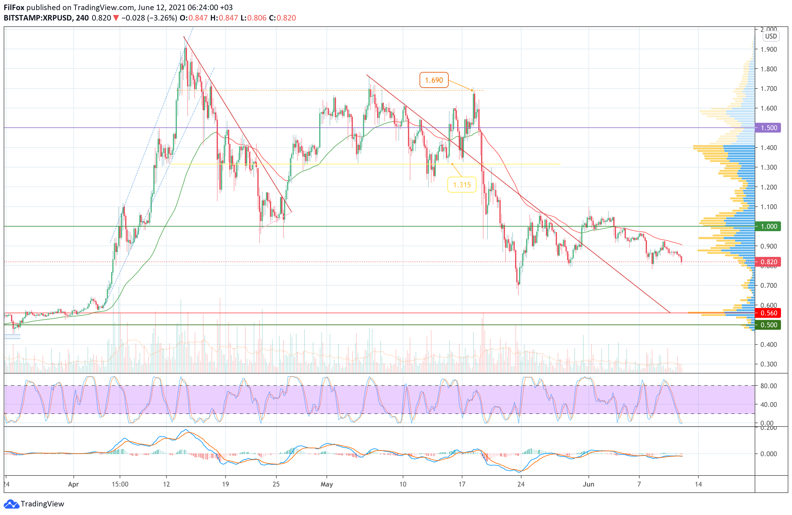 Вчера в первой половине дня поддержка 0.860 USD удерживала пару XRP/USD в узком боковом диапазоне. Вечером слабый медвежий импульс пробил эту поддержку и цена XRP устремилась в район отметки 0.800 USD.