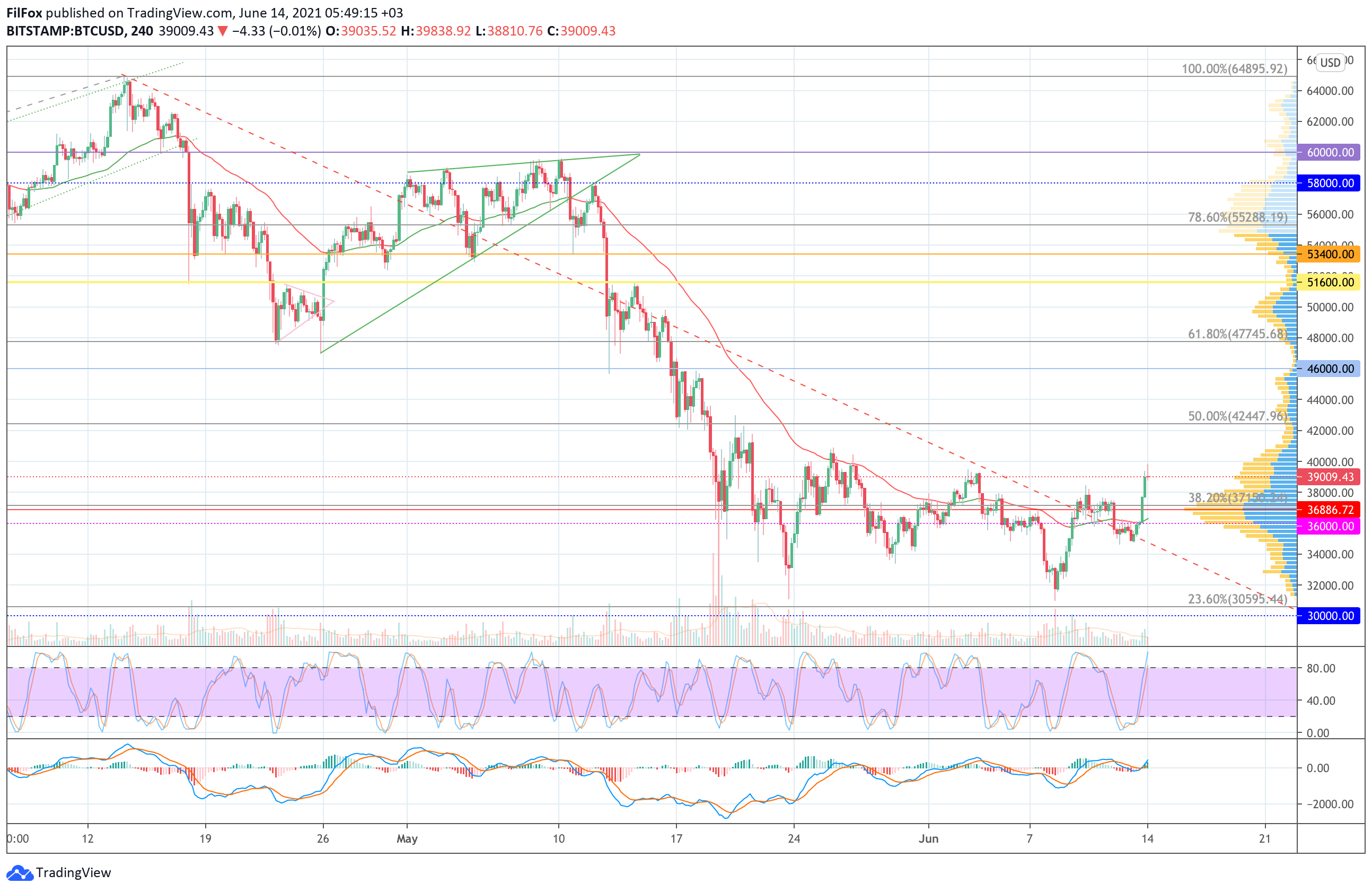 Во второй половине дня бычий импульс пробил сопротивление 36000.00 USD и пара закрепилась выше уровня 38.2% фибо (37150.24 USD). Поздно вечером рост продолжился и цена биткоина преодолела сопротивление 38000.00 USD, а на утро вплотную подобралась к психологической отметке 40000.00 USD. Локальный максимум установлен в точке 39838.00 USD.