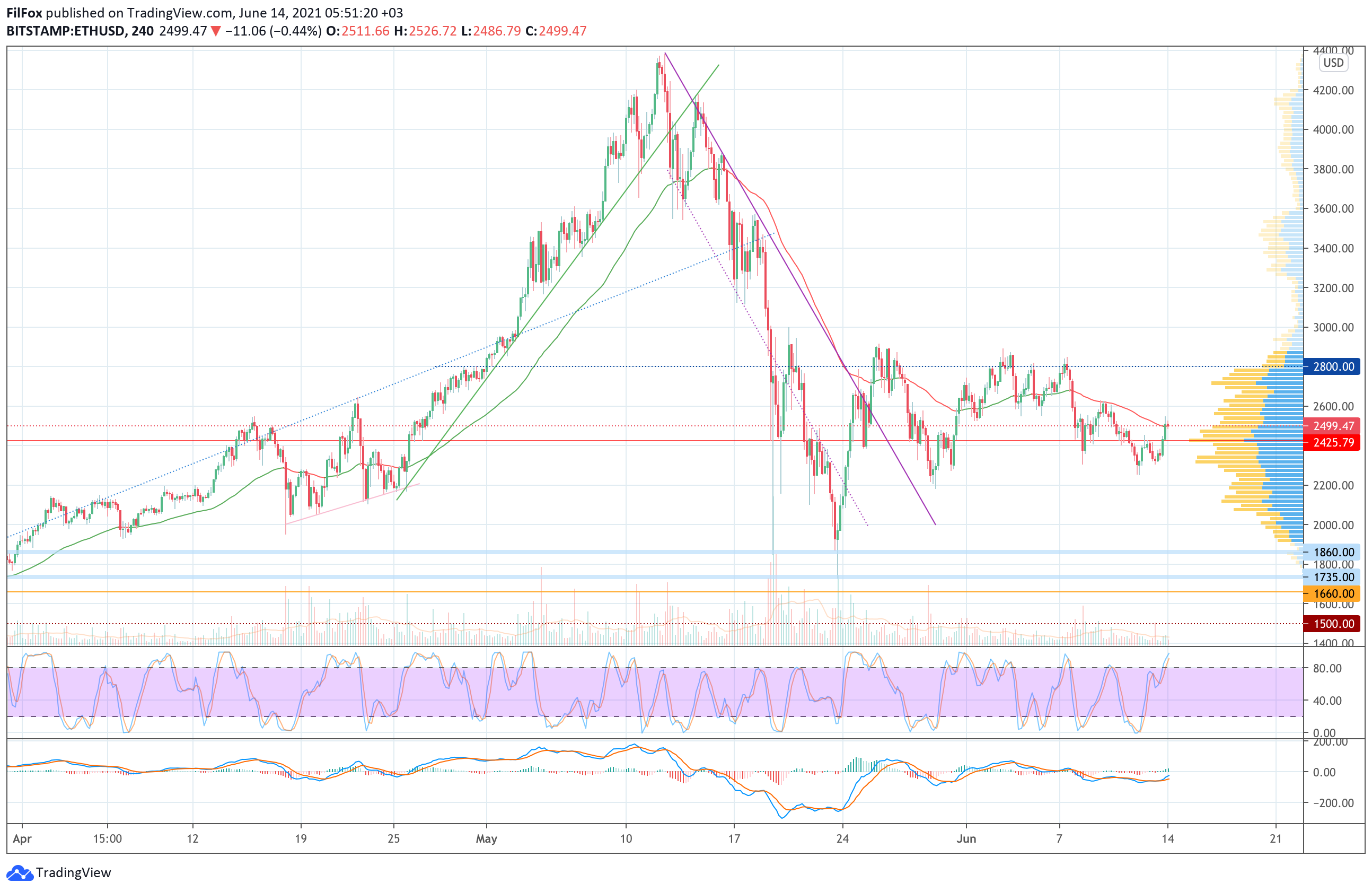 Сегодня ночью цена эфира протестировала отметку 2500.00 USD. Объёмы покупок были не крупные и на утро пара немного откатилась. Если быки нарастят объёмы, то вполне вероятно, что они смогут протестировать сопротивление 2800.00 USD. Без этого медведи довольно быстро вернут пару к индикаторной линии POC (2425.79 USD).