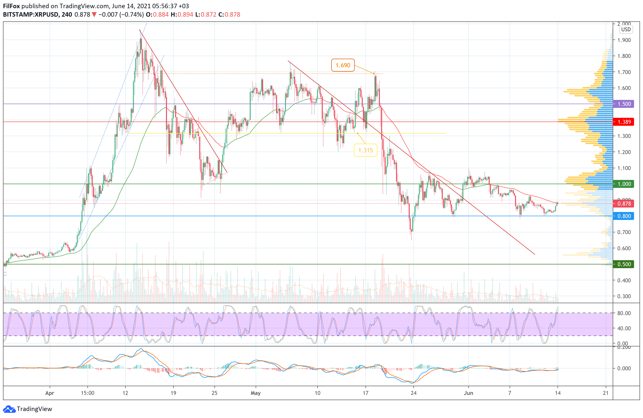 В субботу утром поддержка 0.800 USD удержала пару от дальнейшего снижения и до конца дня цена XRP немного восстановилась. В воскресенье восстановление продолжилось, и в настоящий момент пара вернулась в область средних цен.