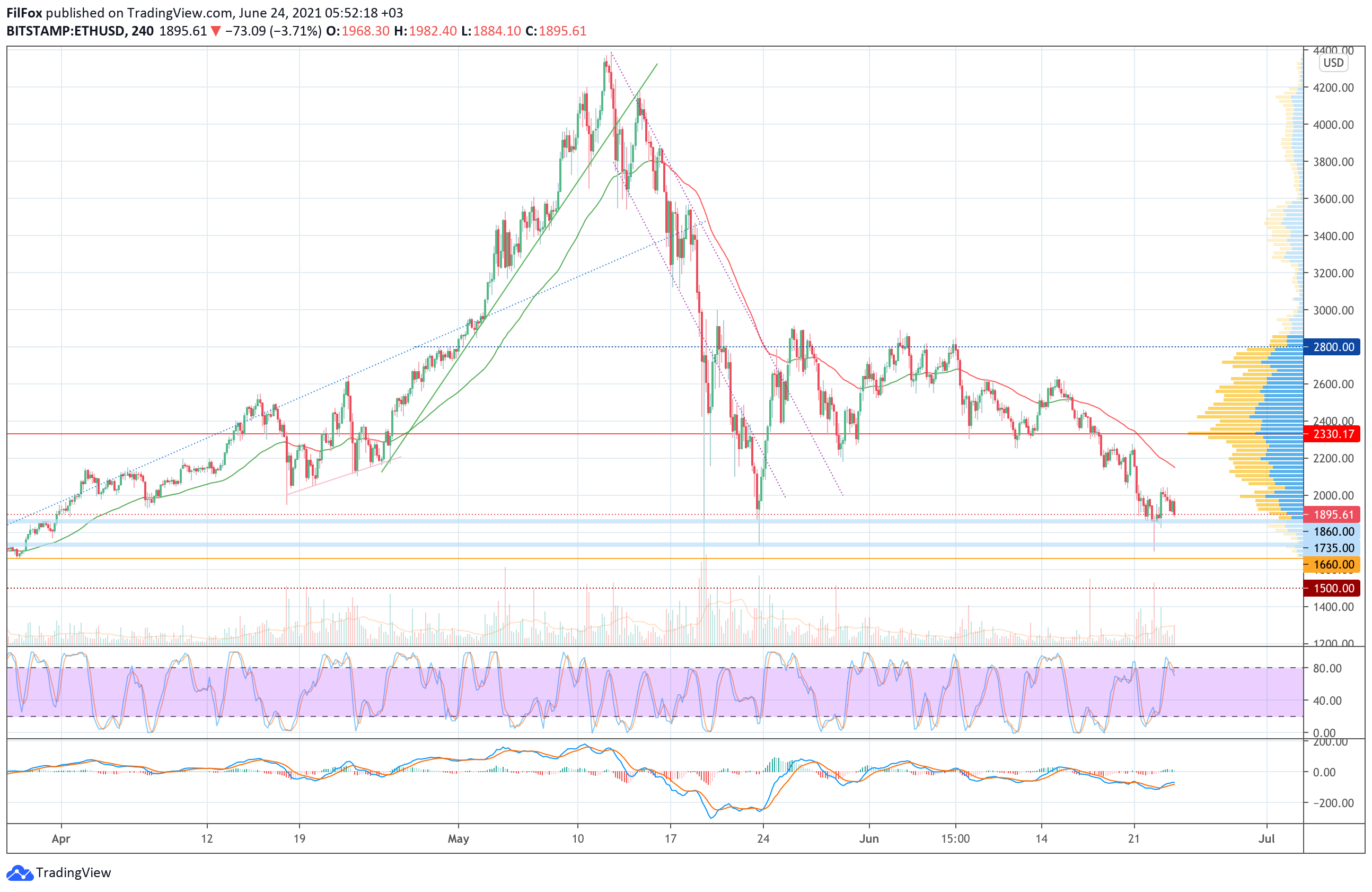 Вчера до обеда покупатели отчаянно пытались удержаться выше психологической отметки 2000.00 USD. Однако, во второй половине дня цена Ethereum откатилась в область 1900.00 USD.