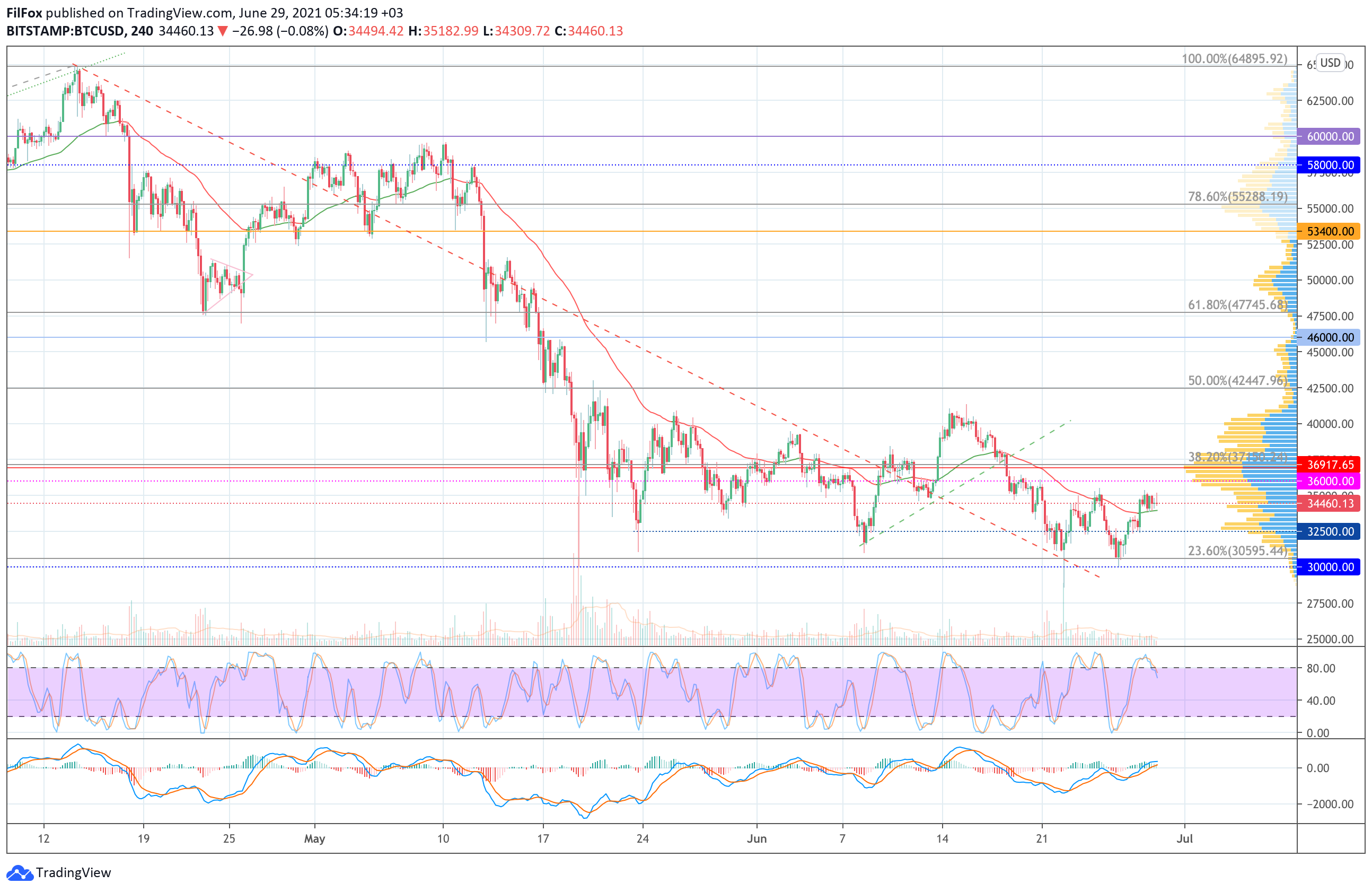 За минувшие сутки цена биткоина закрепилась выше четырёхчасовой EMA55 в боковой консолидации. Покупатели уже несколько раз успели проверить на прочность сопротивление 35000.00 USD, но так и не смогли прорваться к главному сиреневому уровню на отметке 36000.00 USD.