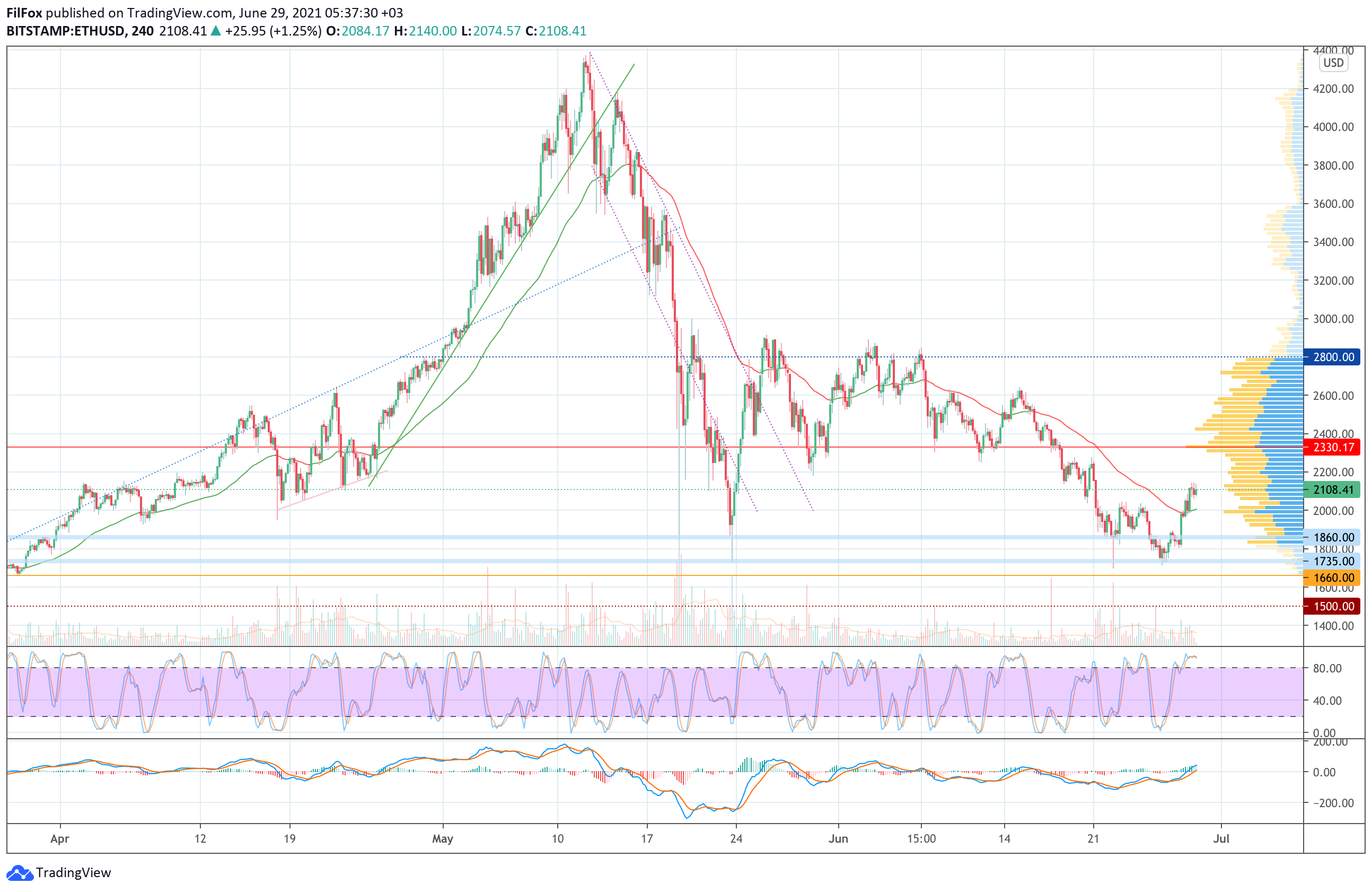 Вчерашний дневной максимум цена ETH установила в точке 2145.00 USD. Сегодня ночью покупатели попытались сформировать очередной бычий импульс, но мелкие объёмы не позволили паре продолжить восстановление.