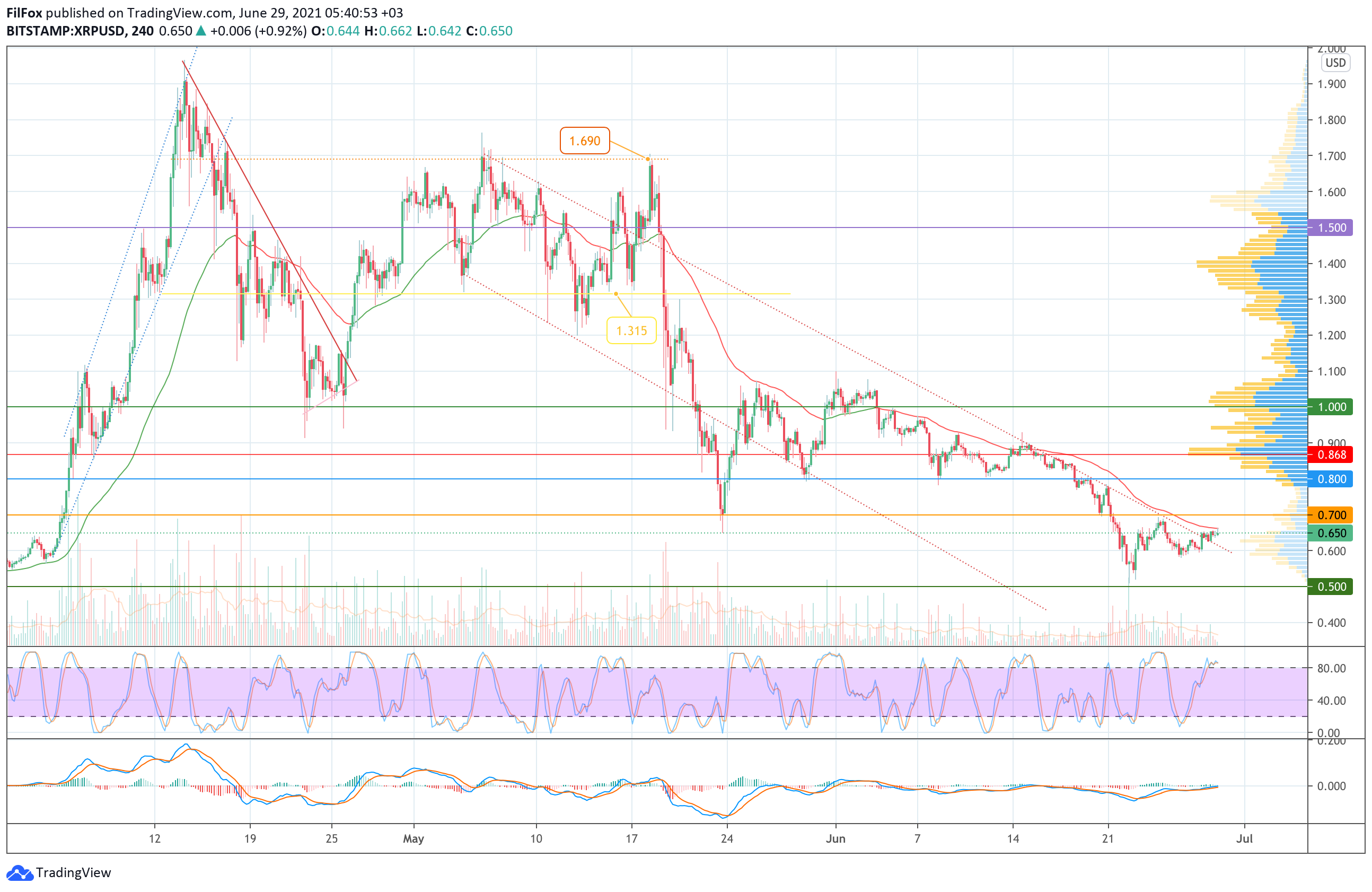 В настоящее время объёмы торгов достаточно низкие, но если быки смогут усилить натиск, то они прорвут уровень средних цен и продолжат рост выше отметки 0.700 USD.