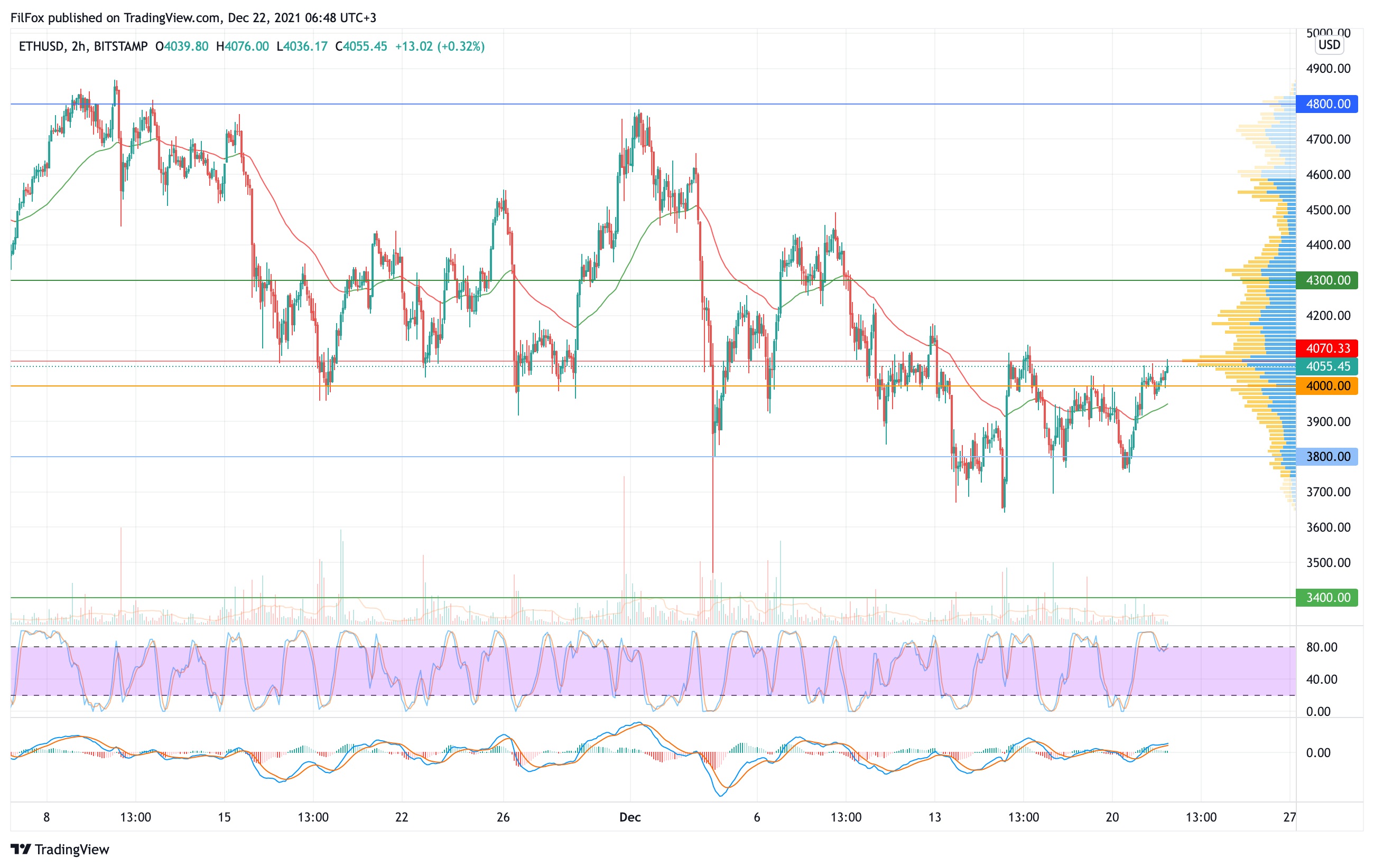 Сегодня покупатели попытаются воспользоваться поддержкой на уровне 4000.00 USD и продолжить восстановление. Однако, если прорваться выше индикаторной линии Volume Profile не получится, то медведи воспользуются шансом вернуть пару ниже двухчасовой EMA55.