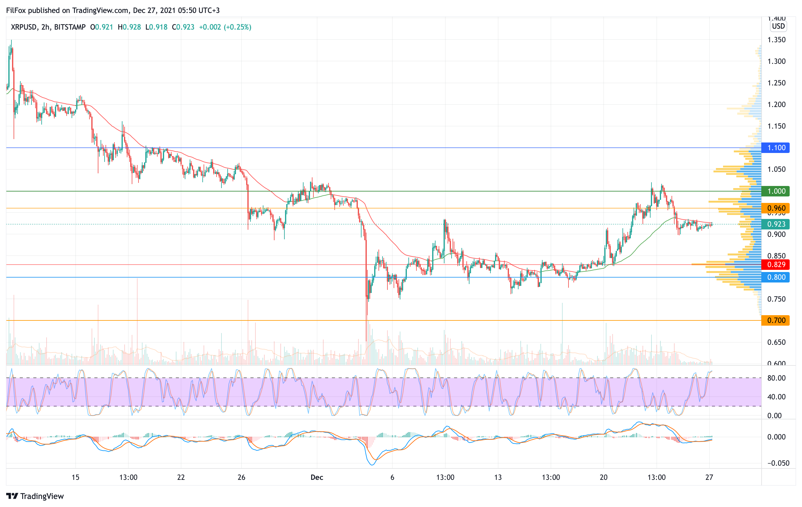 На выходных цена XRP пыталась продолжить восстановление, но двухчасовая EMA55 сдержала рост пары в область оранжевого уровня 0.960 USD.