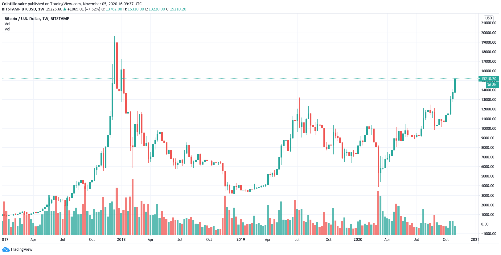 Сегодня днём цена биткоина пробила $15000, и многие трейдеры начали надеяться на повторение бычьего забега 2017 года.