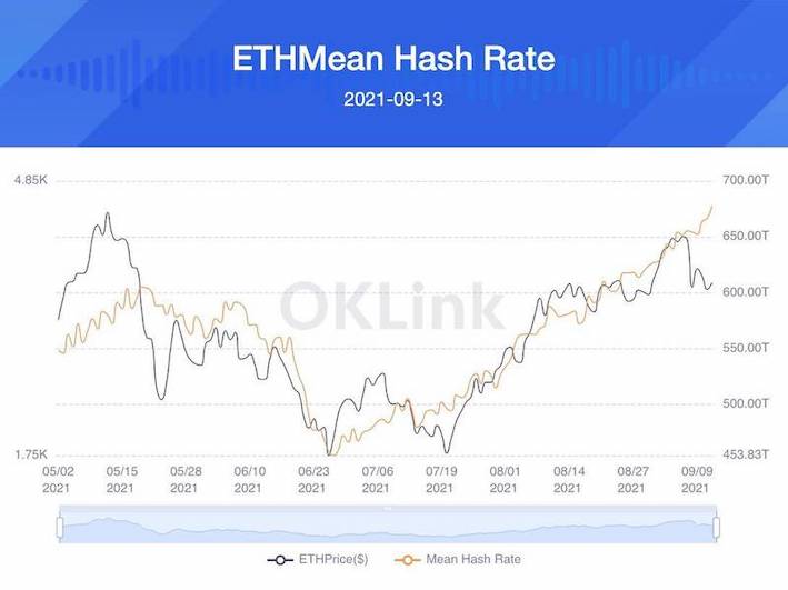 Согласно информации Etherscan, хешрейт эфириума в воскресенье достиг 715.4 TH/s. Согласно информации OKLink, хешрейт поднимался до 677.9 TH/s. Обе платформы показывают, что это рекордный показатель за все время. Предыдущий рекорд был установлен 19 мая - Etherscan зафиксировал 632.8 TH/s, а OKLink 604.5 TH/s.