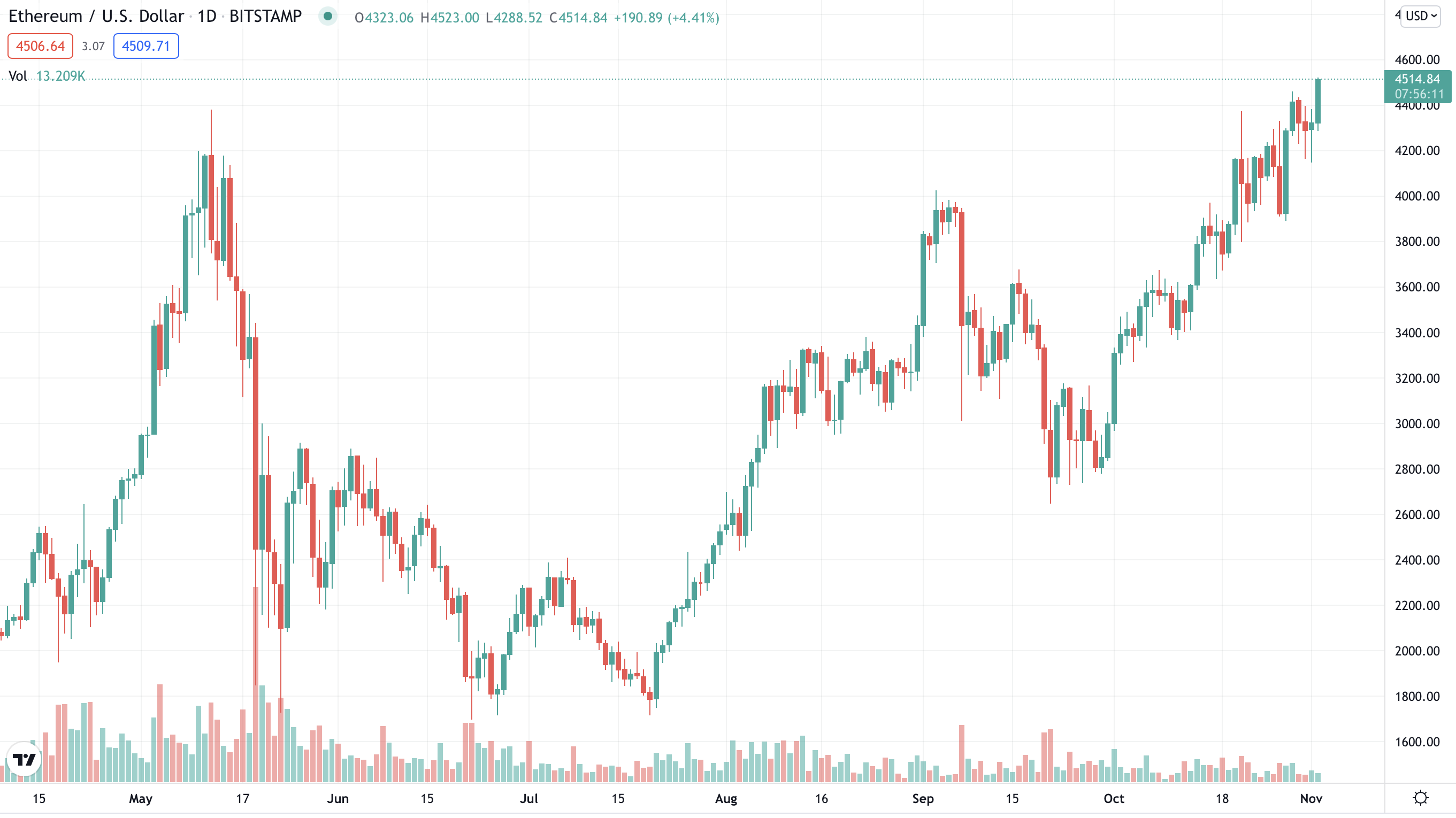 2 ноября цена эфира установила новый исторический максимум выше отметки $4,500.