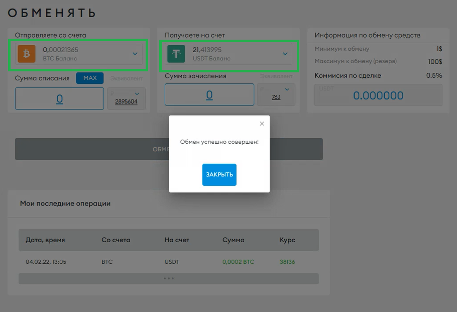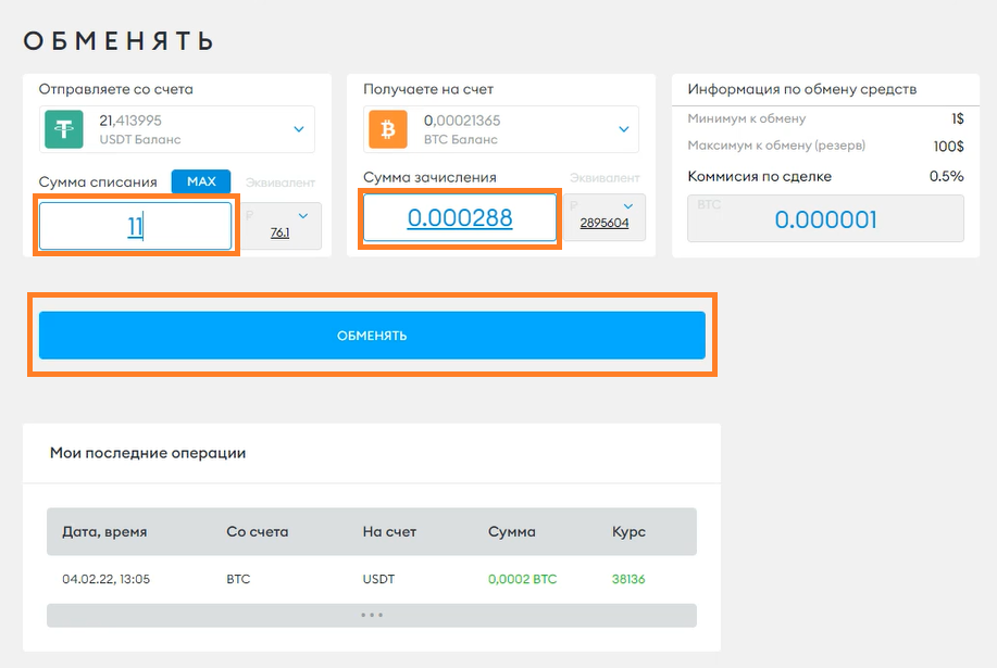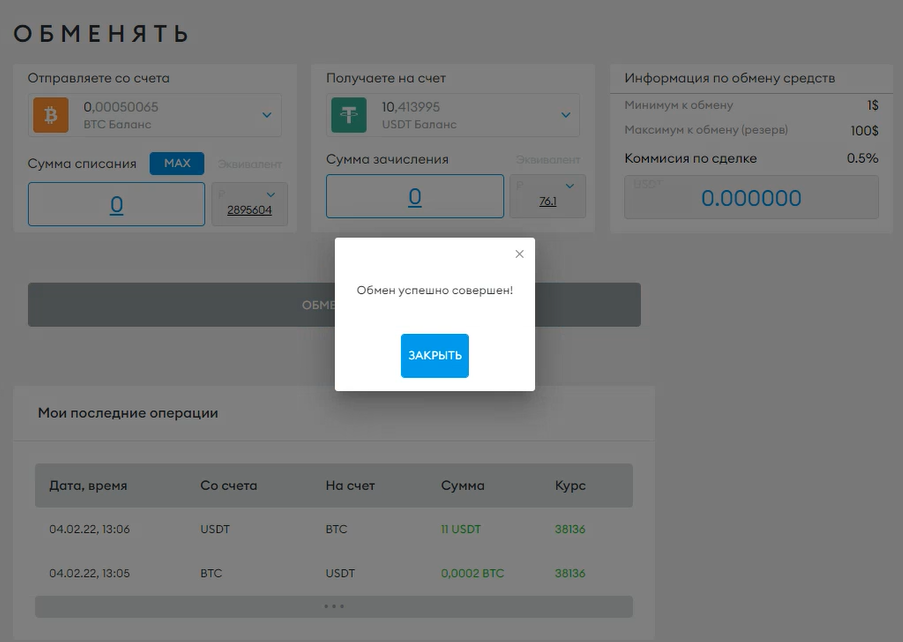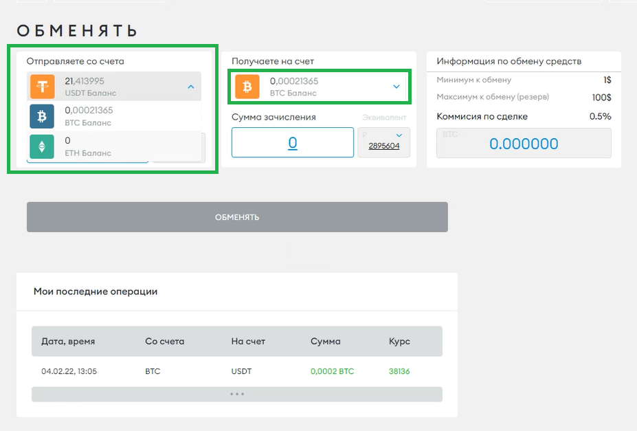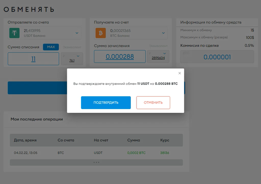 Обмен доступен между валютами BTC, USDT, ETH.