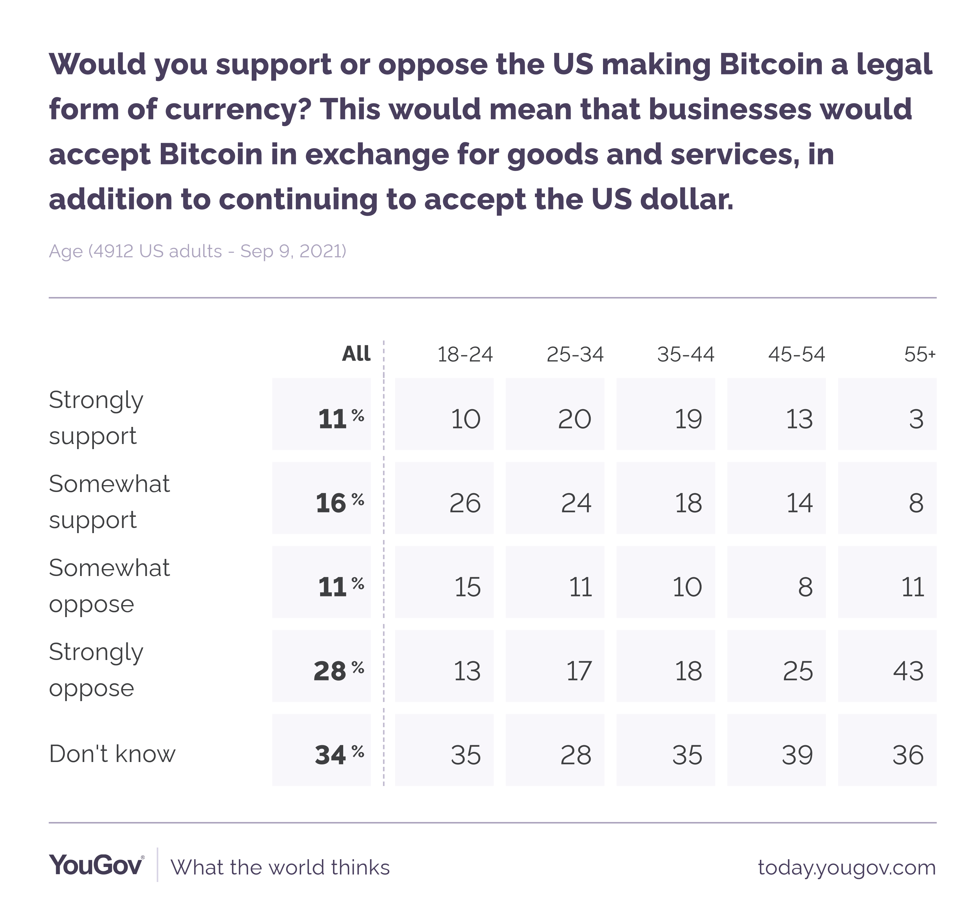 Результаты опроса аналитической компании YouGov показали, что 27% жителей США поддерживают легализацию биткоина как платежного средства.