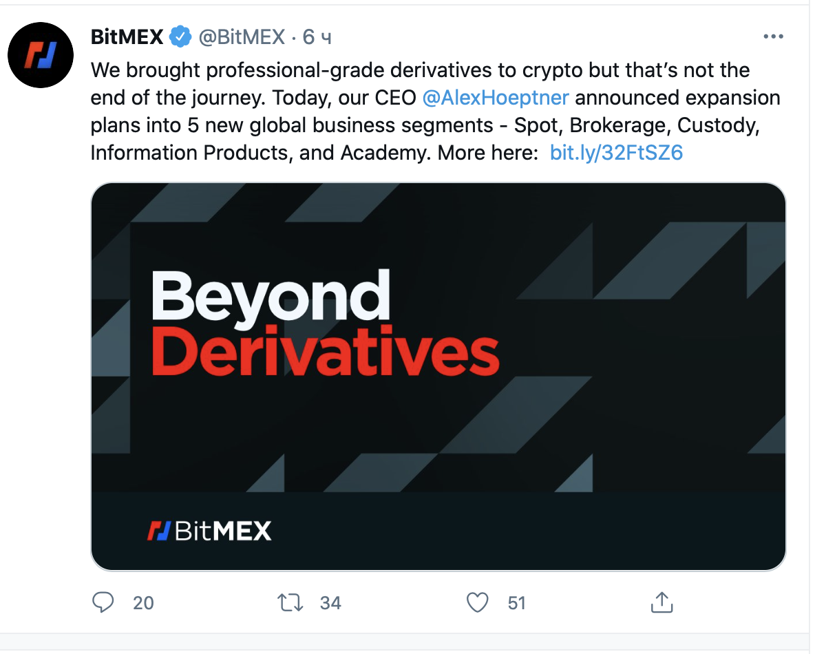 Под руководством нового генерального директора Александра Хептнера компания пытается создать новый имидж. BitMEX заявила, что добавит 5 новых бизнес-сегмента - спот, брокера, услугу хранения, инфо продукты и академию.