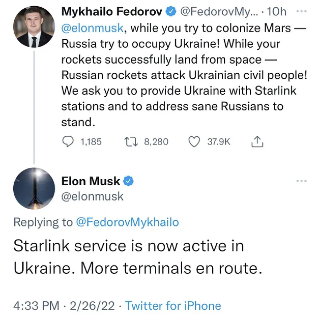 Примерно через 10 часов после того, как министр цифровой трансформации Украины Михаил Федорова попросил помочь стране, предоставив доступ к интернету Starlink, Илон Маск написал в своем твиттере: