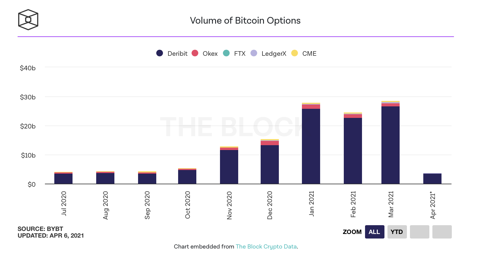 Между тем, с января по март объем торгов опционами вырос на 16.19% и в прошлом месяце составил $28.63 миллиарда. 96.26% объема пришлось на Deribit, 3.37% на OKEx и 2.02% на CME.